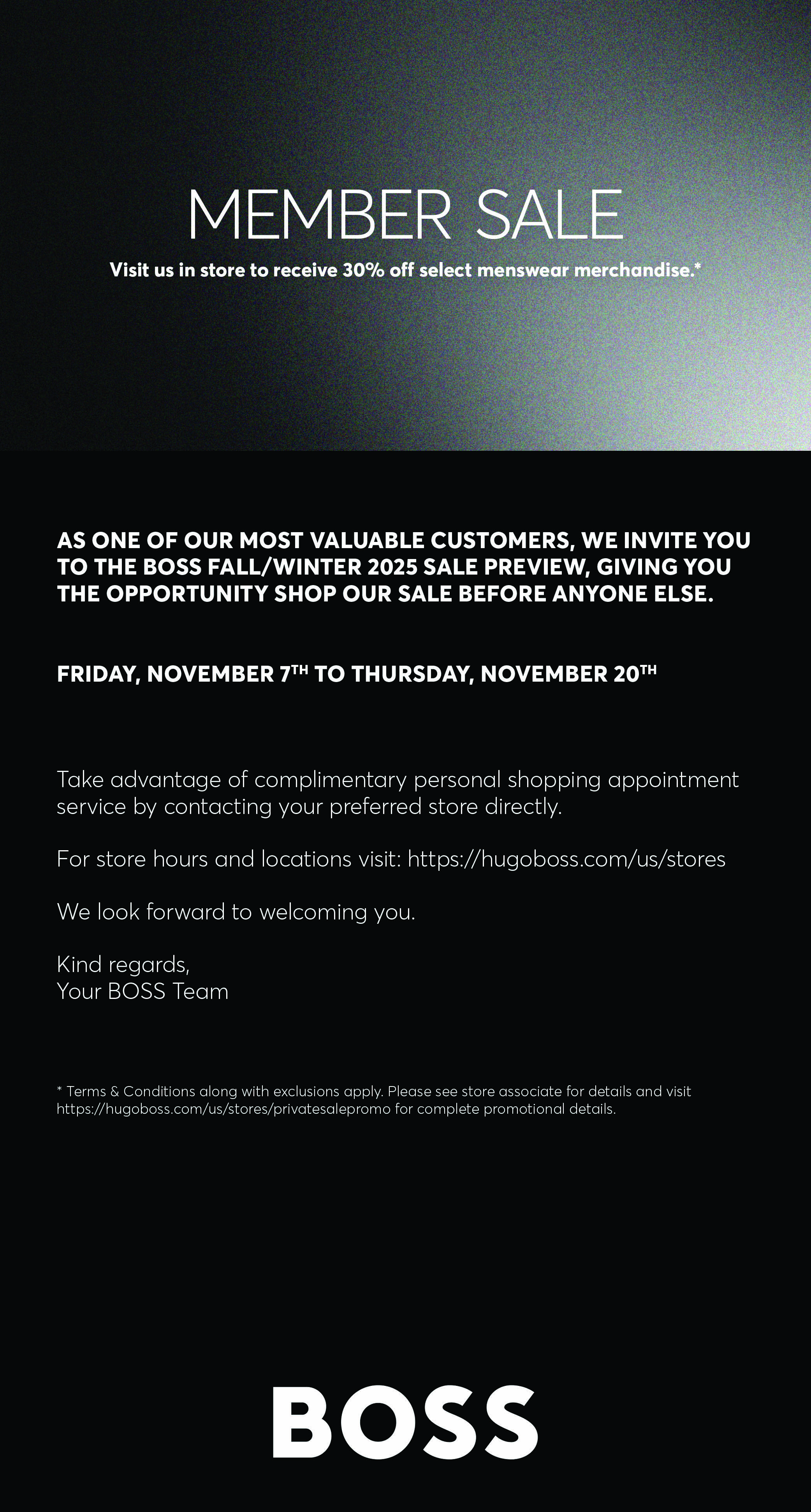 Join Hugo Boss for their Fall/Winter 2025 preview event at Fashion Show Las Vegas on Saturday, November 15. You'll get to shop the latest fashions while supporting the fight against hunger in Southern Nevada to benefit Three Square Food Bank.