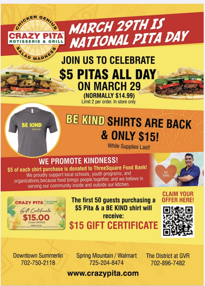 Celebrate National Pita Day on Sunday, March 29, with Crazy Pita. Enjoy $5 pitas all day and the chance to purchase a Be Kind shirt. A portion of the proceeds from t-shirt sales will support Three Square Food Bank.
